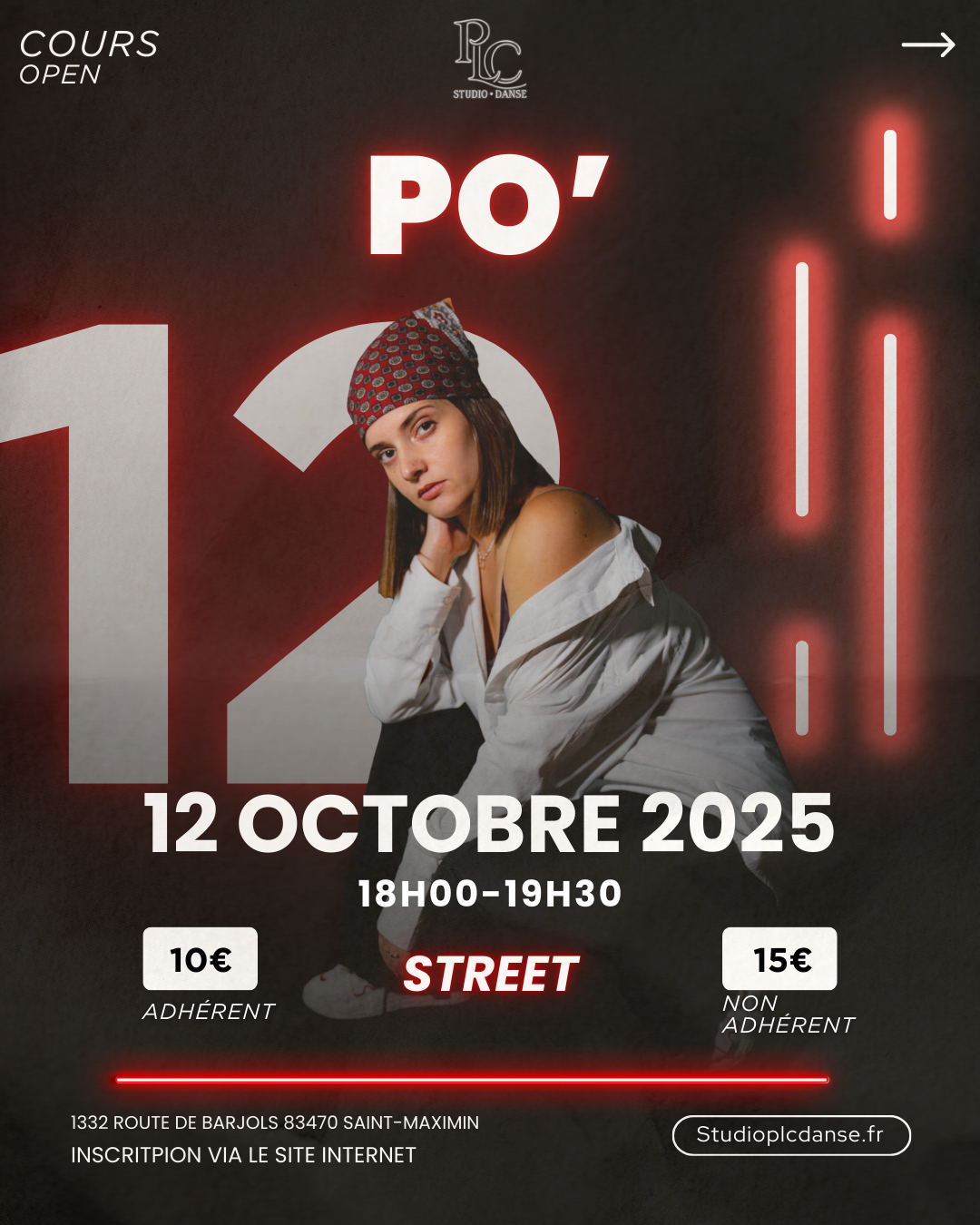 Le cours open de Street aura lieu le dimanche 12 octobre 2025 au Studio PLC’ Danse, sur réservation obligatoire.