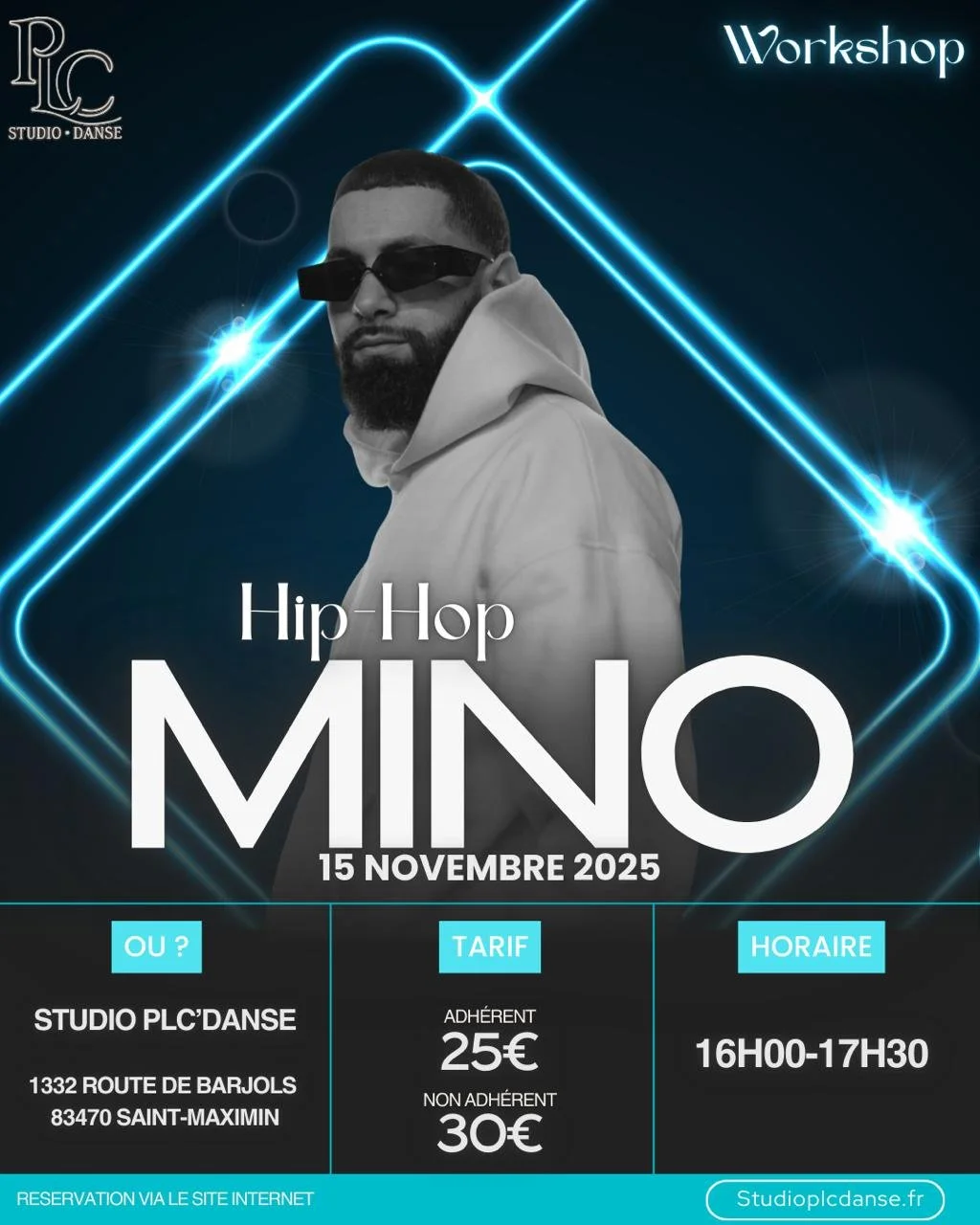 Le workshop de Hip-Hop avec Mino aura lieu le samedi 15 novembre 2025 au Studio PLC’ Danse, sur réservation obligatoire.
